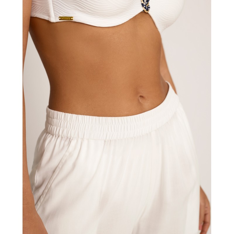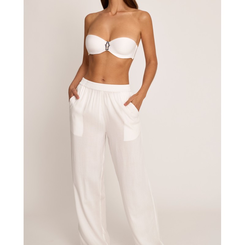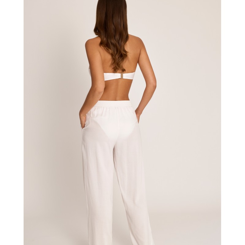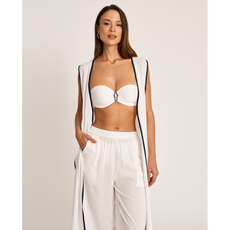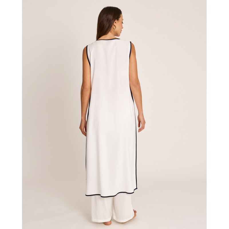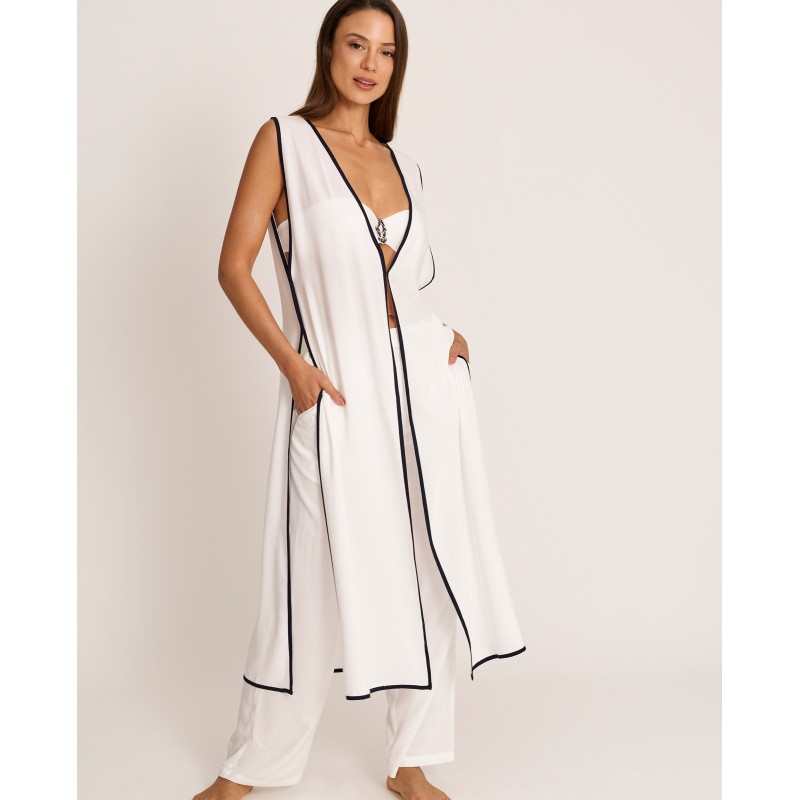 Conjunto de dos piezas compuesto por pantalón largo con bolsillos y chaleco largo. Pertenece a una colección de baño de líneas puras y diseño atemporal donde la simplicidad se convierte en elegancia. Pensada para mujeres que valoran la sofisticación discreta y sin excesos. Un conjunto perfecto para completar tu outfit de verano.