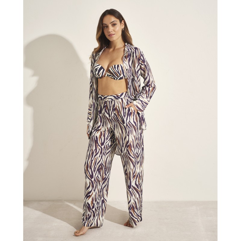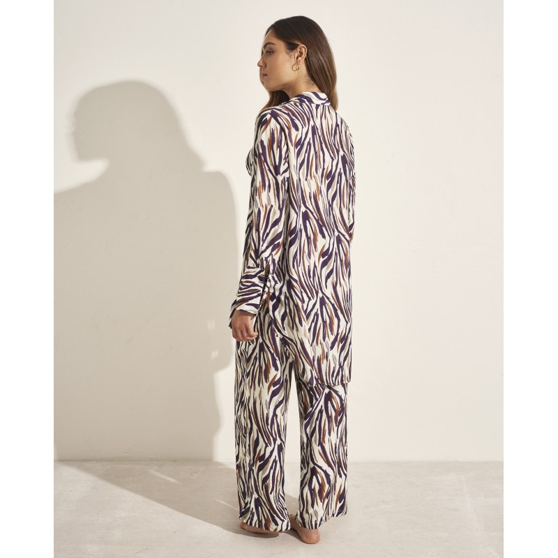 Conjunto de dos piezas compuesto por camisa manga larga y pantalón largo. Con un diseño inspirado en la flora y fauna de Tanzania. Luce radiante con su original estampado con tonalidades que nos transportan a este paraíso africano.