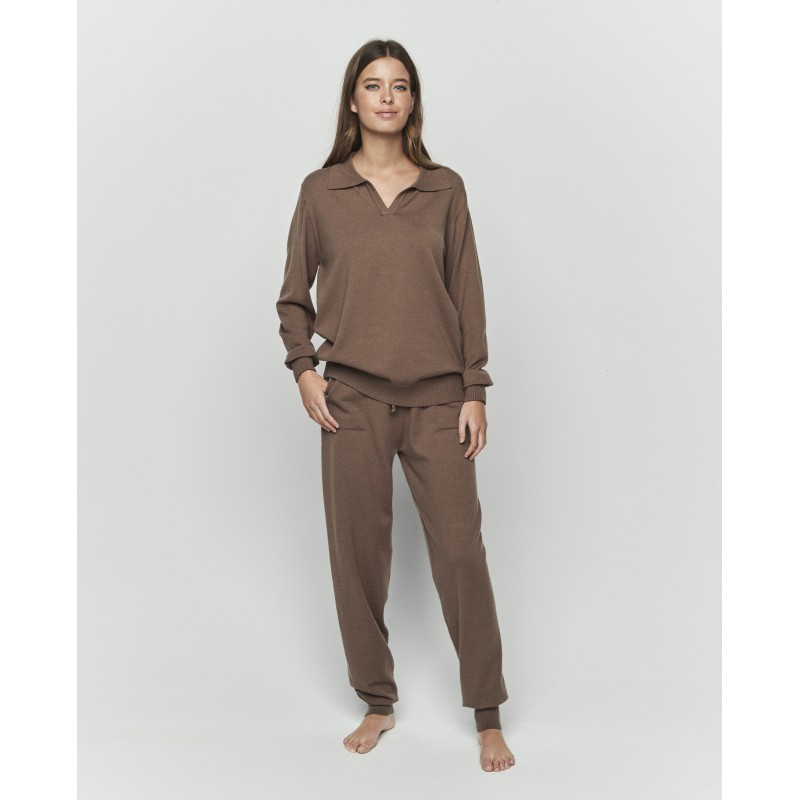 Conjunto de punto compuesto por parte de arriba de manga larga y cuello estlo polo y pantalón largo con puño y bolsillos. Es un conjunto versátil que te acompaña desde la comodidad del hogar hasta tus planes al aire libre.