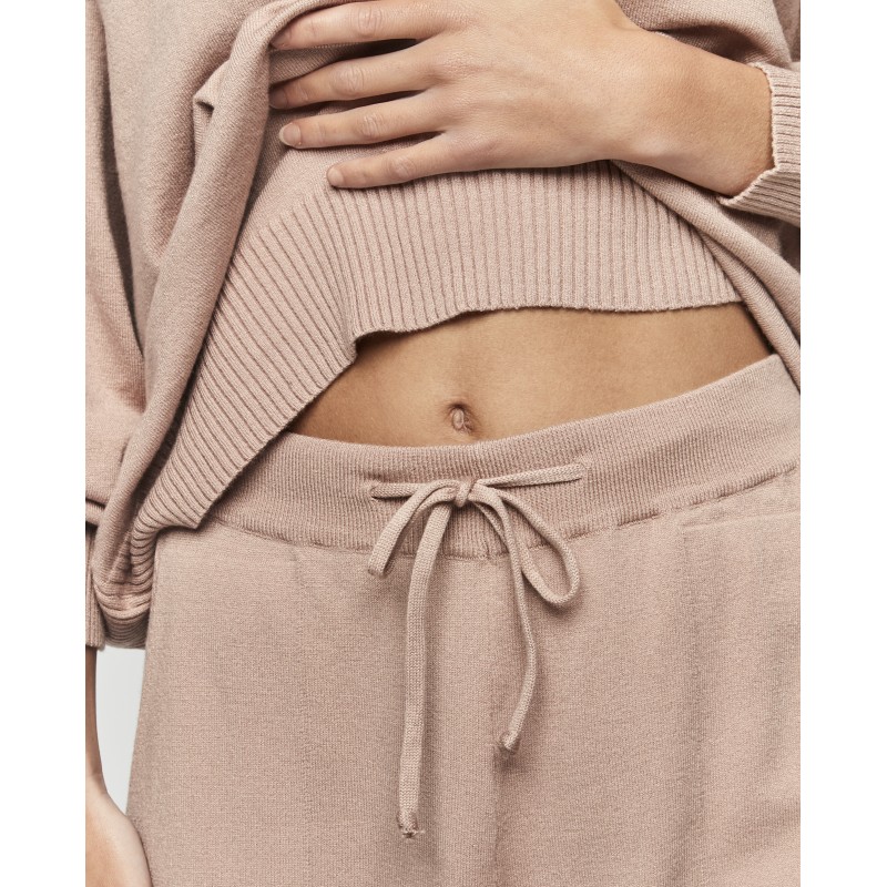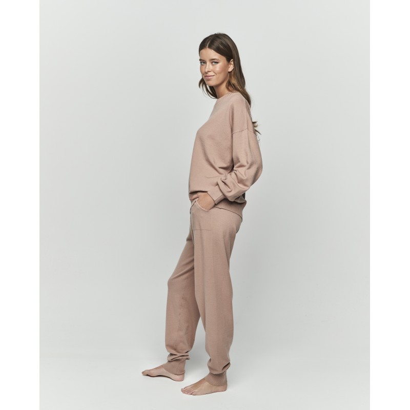 Conjunto de punto compuesto por parte de arriba de manga larga y cuello redondo y pantalón largo con puño y bolsillos. Es un conjunto versátil que te acompaña desde la comodidad del hogar hasta tus planes al aire libre.