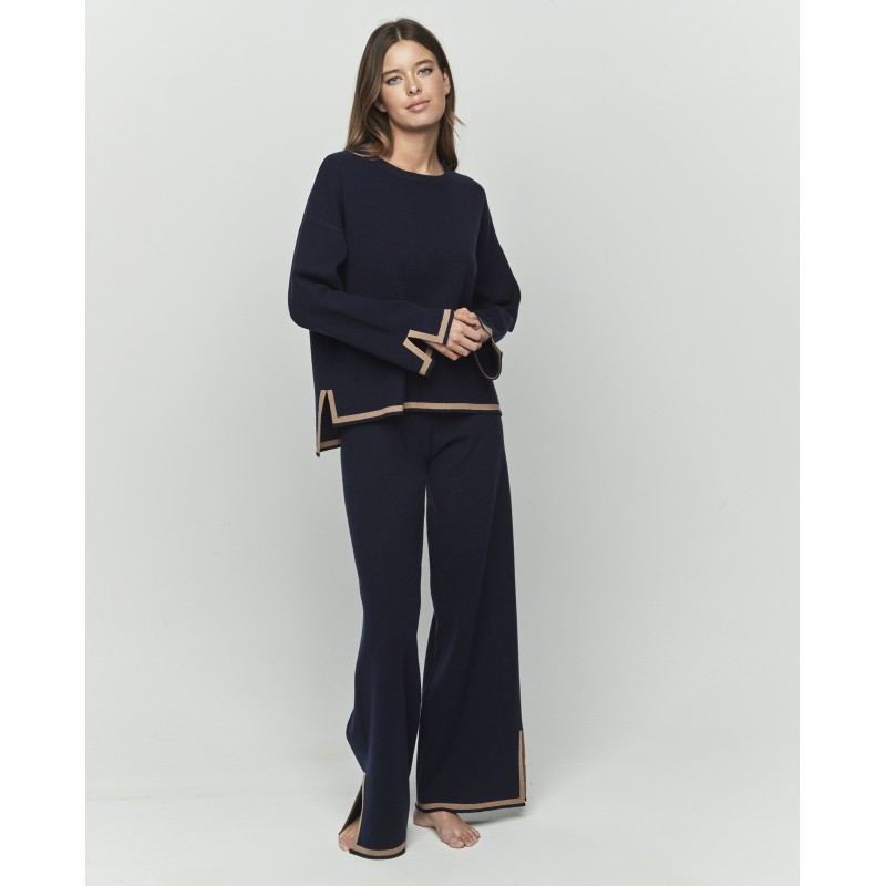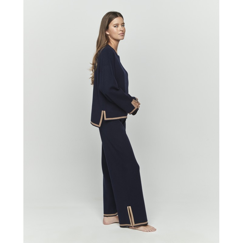 Conjunto de punto compuesto por parte de arriba de manga larga y cuello redondo y pantalón largo. Un conjunto práctico que se adapta tanto a tus días en casa como a tus salidas.