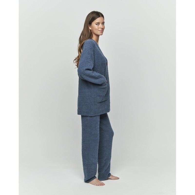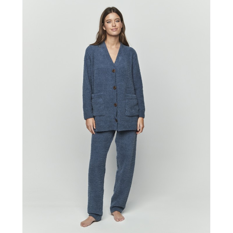 Conjunto sport compuesto por pantalón largo y chaqueta con cuello en V, botones delanteros y bolsillos. Su suave y confortable tejido hará que te sientas como estar entre las nubes. Ideal para días frios de invierno.