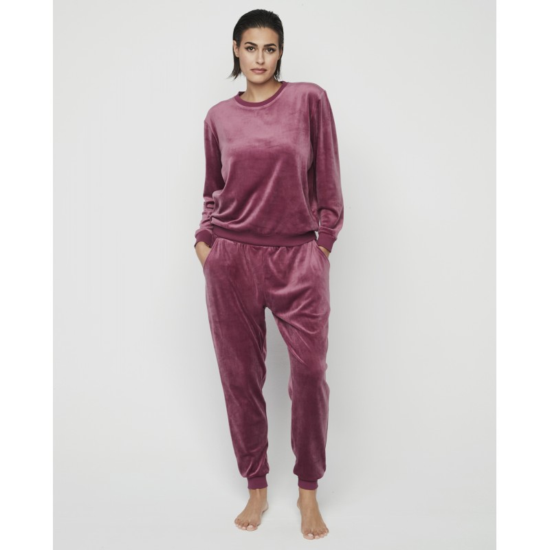 Conjunto sport compuesto por pantalón largo y sudadera de cuello redondo. Este conjunto será tu aliado para estar cómoda y con estilo tanto dentro como fuera de casa.