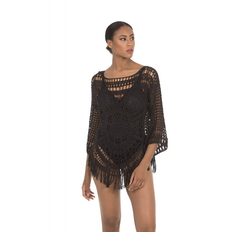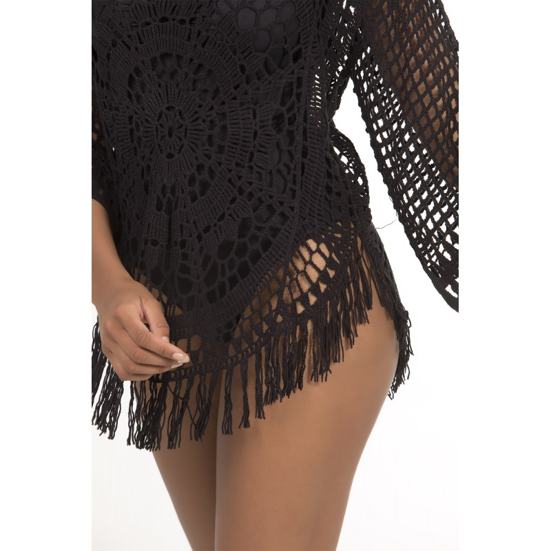 Jersey crochet de manga larga con flecos en el bajo. De color negro.