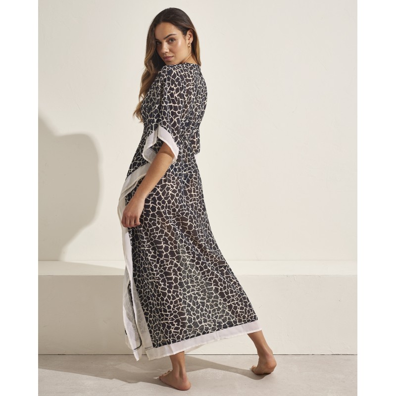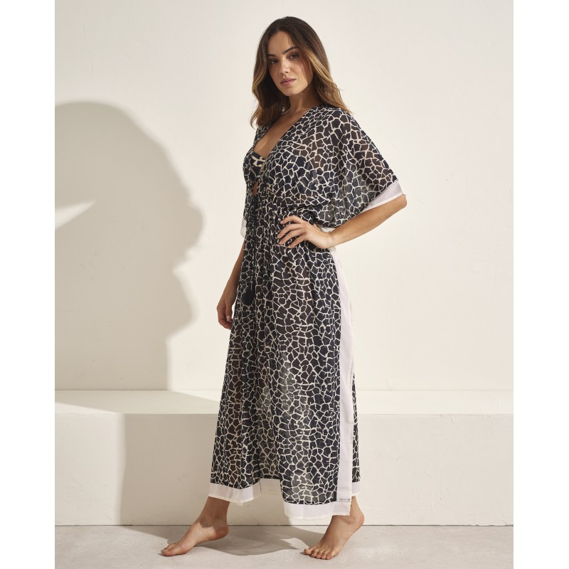 Kaftan. Con un diseño femenino y original, este estampado está inspirado en el Salar de Uyuni, donde cada figura geométrica representa la intersección entre lo natural y lo abstracto, creando un paisaje visual fascinante. Ideal para llevar sobre tu bikini o bañador.