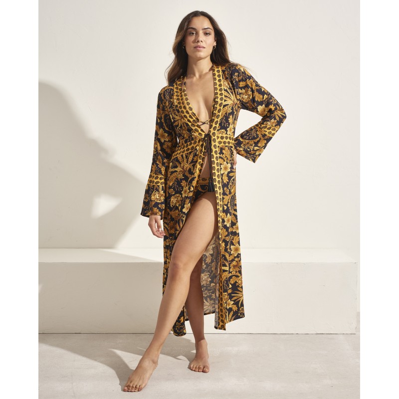 Kimono. Atrévete a destacar con un diseño único que combina sofisticación y modernidad gracias a su estampado innovador y su corte impecable. Ideal para completar tu look veraniego.