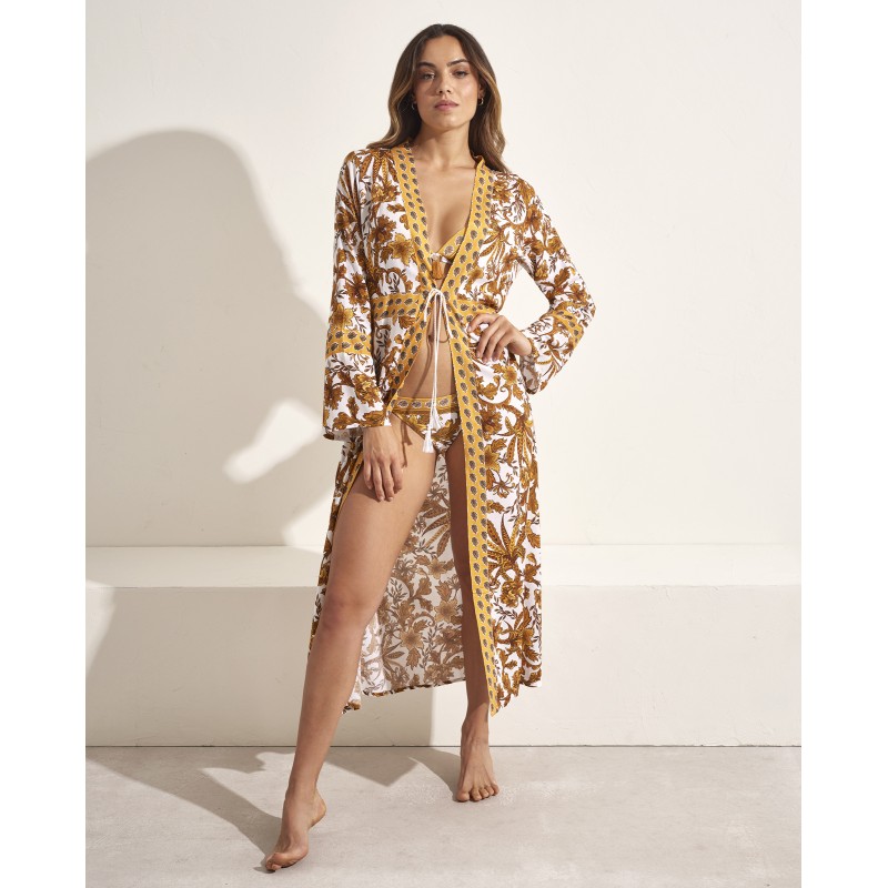 Kimono. Atrévete a destacar con un diseño único que combina sofisticación y modernidad gracias a su estampado innovador y su corte impecable. Ideal para completar tu look veraniego.