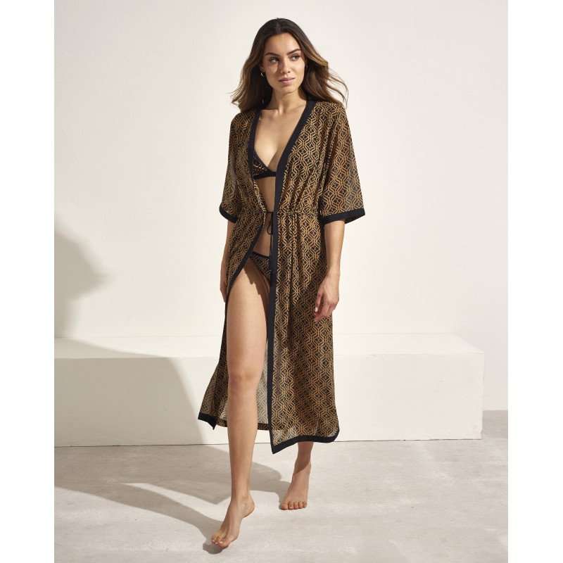 Kimono. Este diseño destaca por su estampado geométrico de estilo retro y su combinación de tonos elegantes lo convierten en una pieza distinguida para lucir esta temporada.