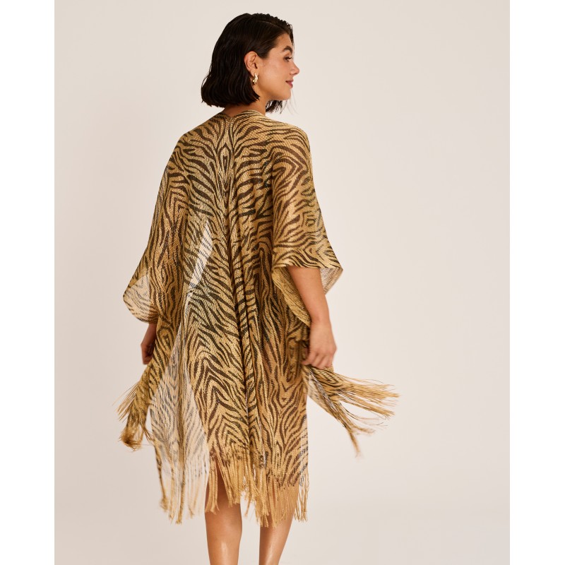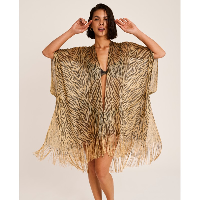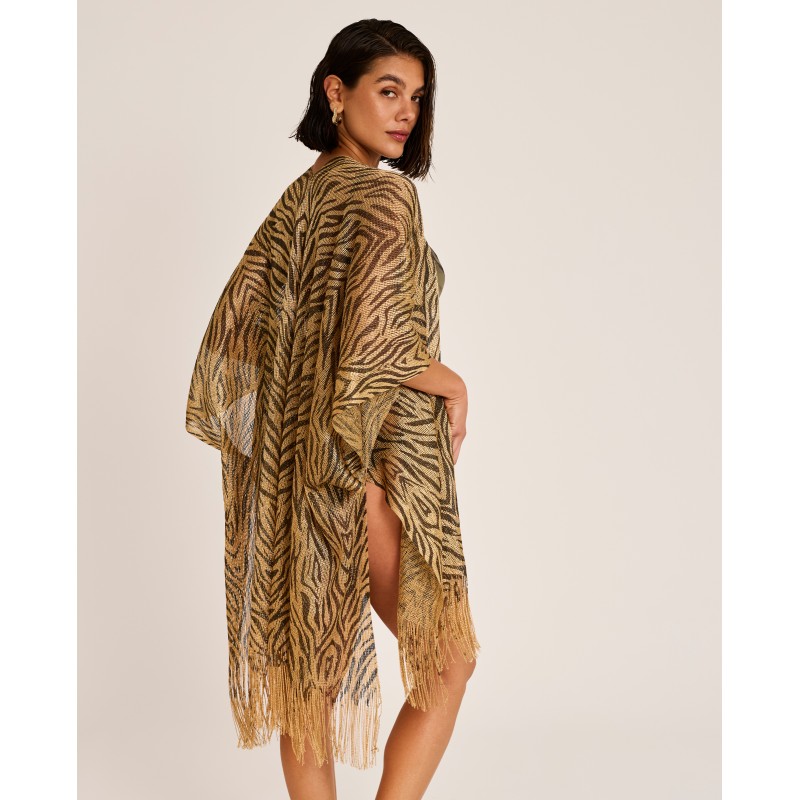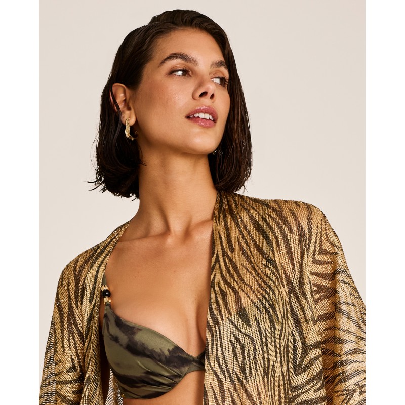 Kimono de diseño fluido con estampado cebra en acabado dorado, que aporta sofisticación, movimiento y un aire distintivo. Perfecto para llevar sobre tu bikini o bañador a juego.