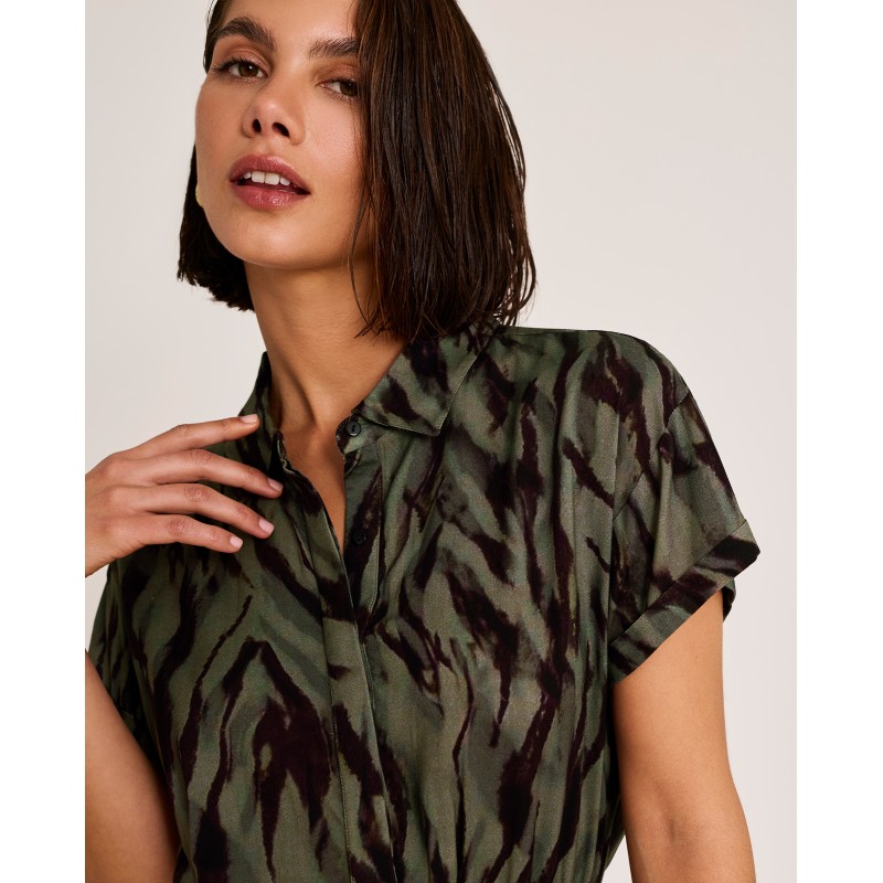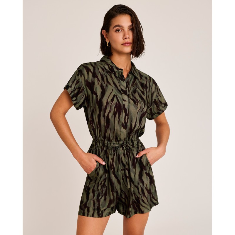 Mono corto estilo camisero con bolsillos y lazo para atar. Su diseño de inspiración salvaje nos conecta con el instinto de nuestra naturaleza y la fuerza interior de una feminidad segura y sensual. Esta pieza está fabricada con materias primas recicladas. Ideal para completar tu look de verano.