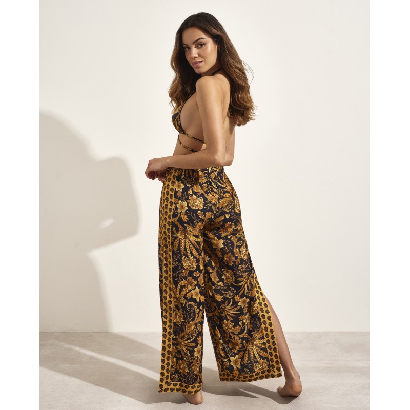 Pantalón tipo palazzo con aberturas laterales. Atrévete a destacar con un diseño único que combina sofisticación y modernidad gracias a su estampado innovador y su corte impecable. Ideal para completar tu look veraniego.