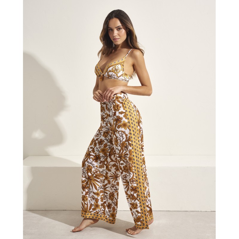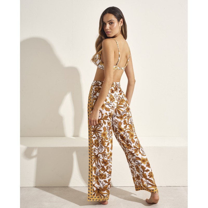Pantalón tipo palazzo con aberturas laterales. Atrévete a destacar con un diseño único que combina sofisticación y modernidad gracias a su estampado innovador y su corte impecable. Ideal para completar tu look veraniego.
