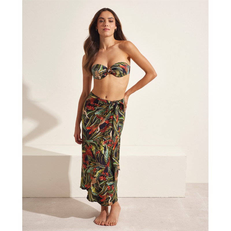 Pareo falda de tejido suave y amplio. Este espectacular diseño con tonos vibrantes inspirado en la flora y fauna salvaje refleja la exuberancia y vitalidad de la naturaleza salvaje tropical. Ideal para llevar a juego con tu bikini o bañador.