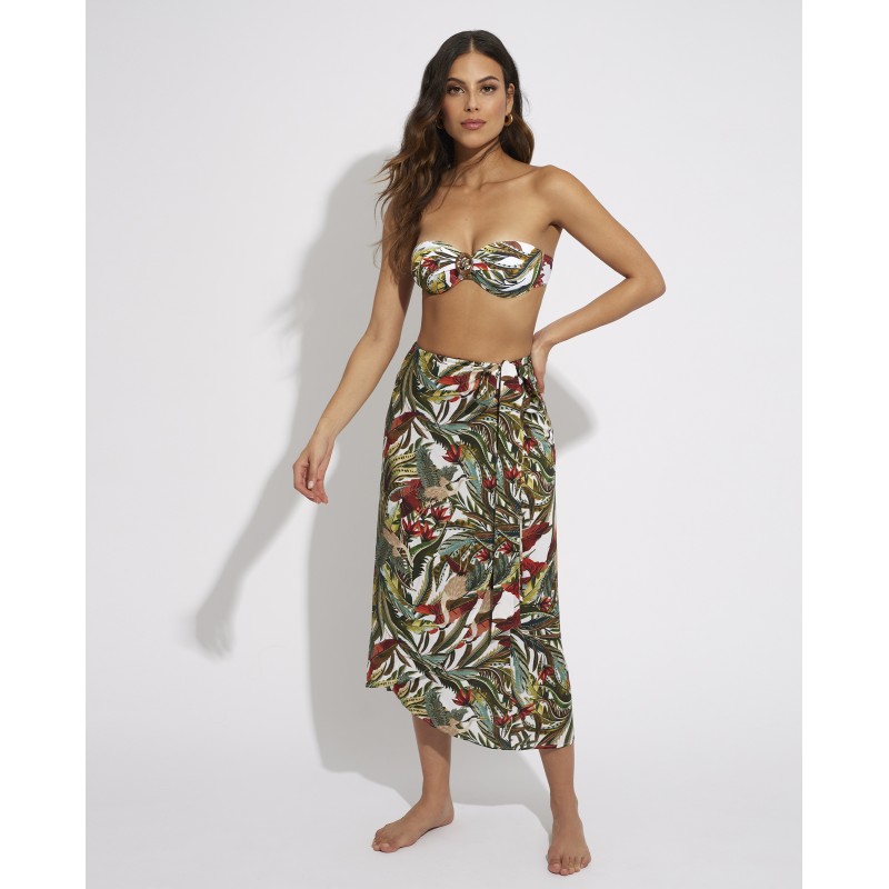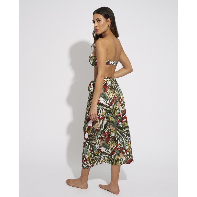 Pareo falda de tejido suave y amplio. Este espectacular diseño con tonos vibrantes inspirado en la flora y fauna salvaje refleja la exuberancia y vitalidad de la naturaleza salvaje tropical. Ideal para llevar a juego con tu bikini o bañador.
