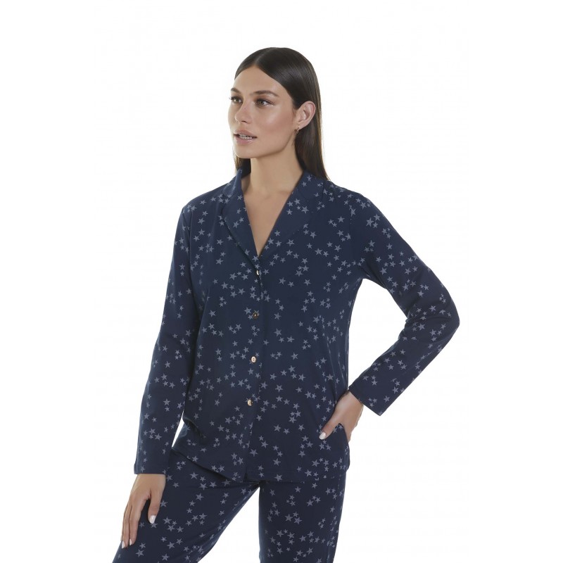 Pijama camisero compuesto por pantalón largo y parte de arriba de corte camisa. Un diseño en algodón con un estampado juvenil, que lo convierte en una combinación ideal para este invierno.