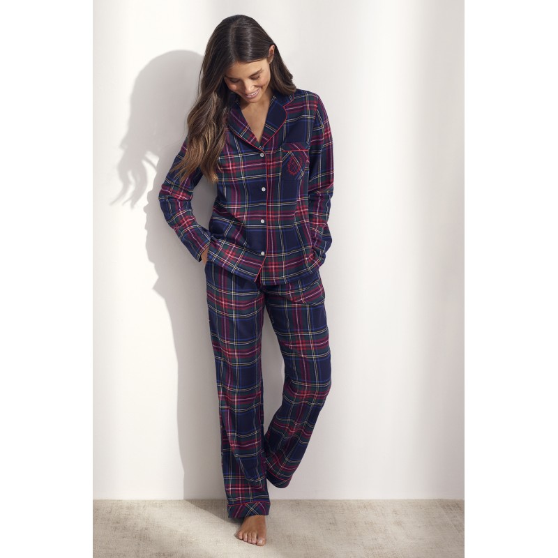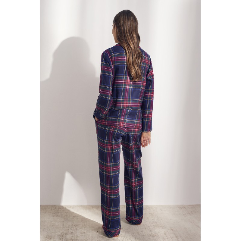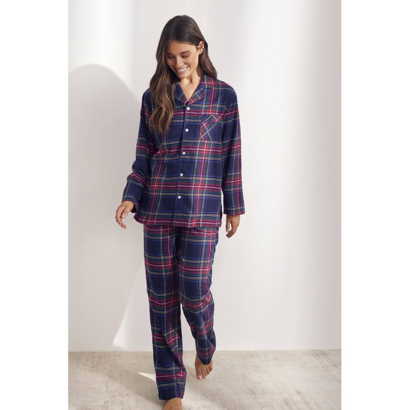 Pijama estilo camisero completo. De diseño a cuadros compuesto por parte de arriba de corte camisa con cierre delantero de botones y pantalón largo.