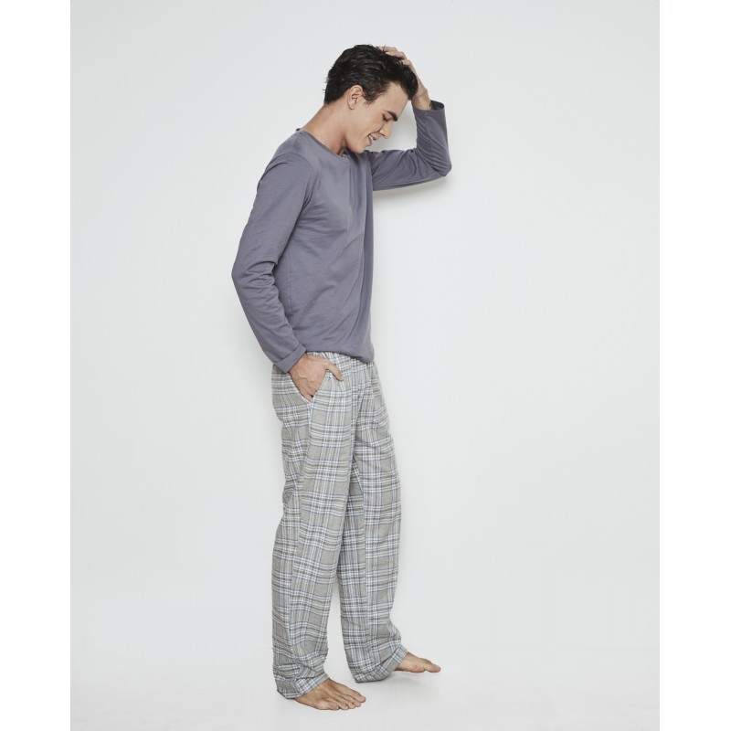Pijama de hombre de dos piezas. Incluye camiseta de manga larga con cuello redondo; la parte inferior, pantalón largo con bolsillos. Con un estampado escocés atemporal este pijama combina estilo y comodidad para tus noches de descanso.