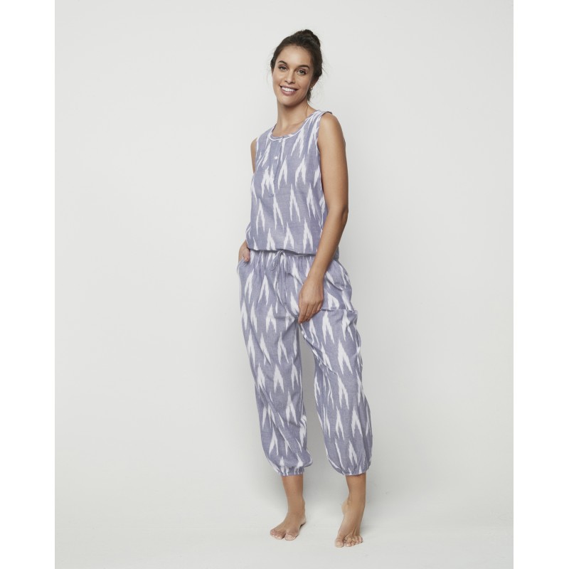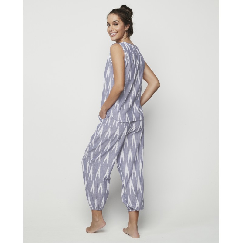 Conjunto de pijama compuesto por dos piezas combinadas 100% algodón: una camiseta de asas con cuello redondo y botones en el pecho, junto con un pantalón largo muy fluido que cuenta con goma ajustable en la cintura. Cuenta con puños en los bajos de cada pernera, lo que logra un efecto abullonado. Además de una prenda cómoda, su estampado estilo étnico lo convierte en una prenda original que evoca frescura y un estilo muy juvenil.