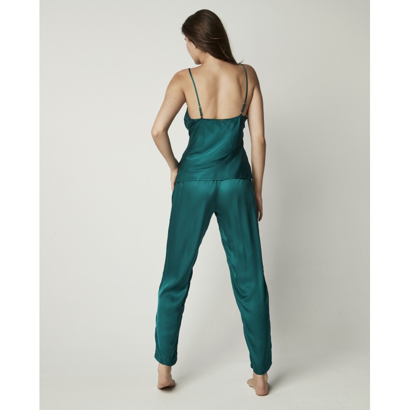 Pijama lencero compuesto por top de tirantes regulables con encaje floral y pantalón largo con goma en la cintura. Una pieza de lencería sofisticada en la que elegancia y confort van de la mano. La colección Federica, a la que pertenece, se caracteriza por formas y estructuras trabajadas con precisión para realzar los contornos de cada mujer y empoderar su confianza, celebrando la individualidad y la feminidad en su máxima expresión.