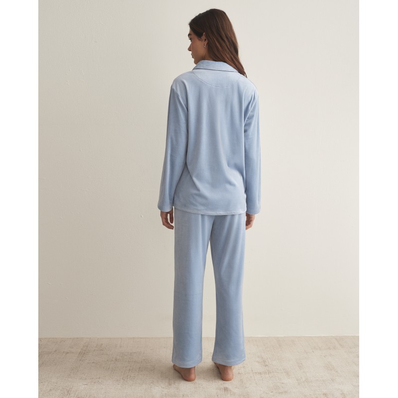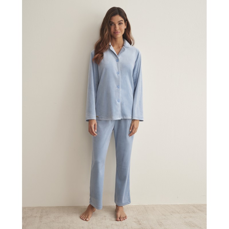 Pijama camisero con cuello pico y abertura delantera con botones y pantalón largo. Su textura extra suave y su diseño de dos piezas te brindan comodidad y elegancia, perfecto para dormir o estar en casa este invierno.