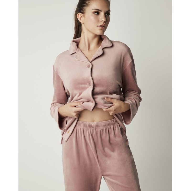 Pijama camisero con cuello pico y abertura delantera con botones y pantalón largo. Su textura extra suave y su diseño de dos piezas te brindan comodidad y elegancia, perfecto para dormir o estar en casa este invierno.
