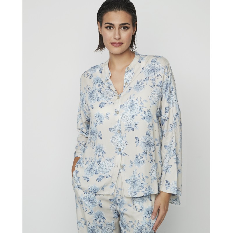 Pijama de mujer de dos piezas. Con parte superior estilo camisa y botones al frente; la parte inferior, pantalón largo de corte clásico. Su estampado floral delicado, en tonos pastel, aporta un toque romántico y elegante, ideal para envolver noches de confort y sutileza.
