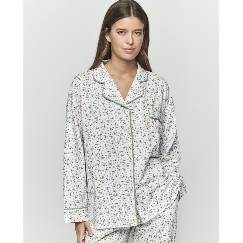 Pijama de mujer de dos piezas. Con parte superior estilo camisa y botones al frente; la parte inferior, pantalón largo de corte clásico. Con un estampado floral romántico que brinda suavidad, frescura y encanto. Comodidad absoluta para tus momentos en casa.