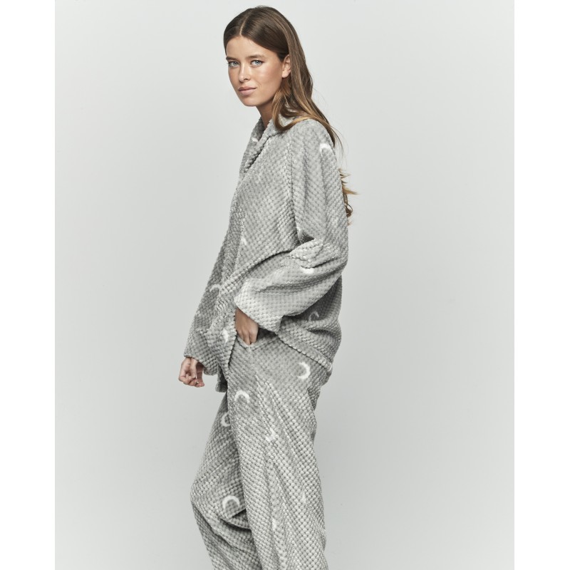 Pijama de mujer de dos piezas. Con parte superior estilo camisa y botones al frente; la parte inferior, pantalón largo de corte clásico. Gracias a su tejido super soft, descansar en casa con este conjunto se convertirá en tu mejor plan.estampado combina elegancia y comodidad para tu descanso.