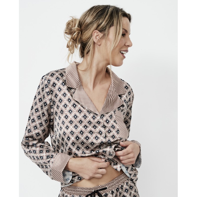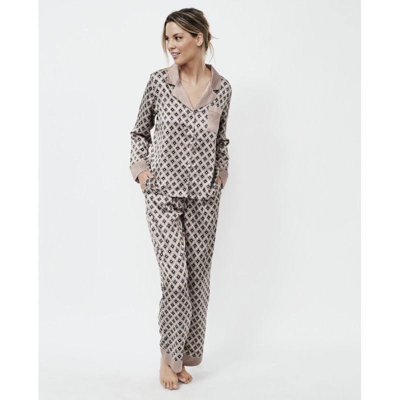 Pijama de mujer de dos piezas. Con parte superior estilo camisa y botones al frente; la parte inferior, pantalón largo de corte clásico. Con este exquisito estampado cada noche se llena de encanto y sofisticación.