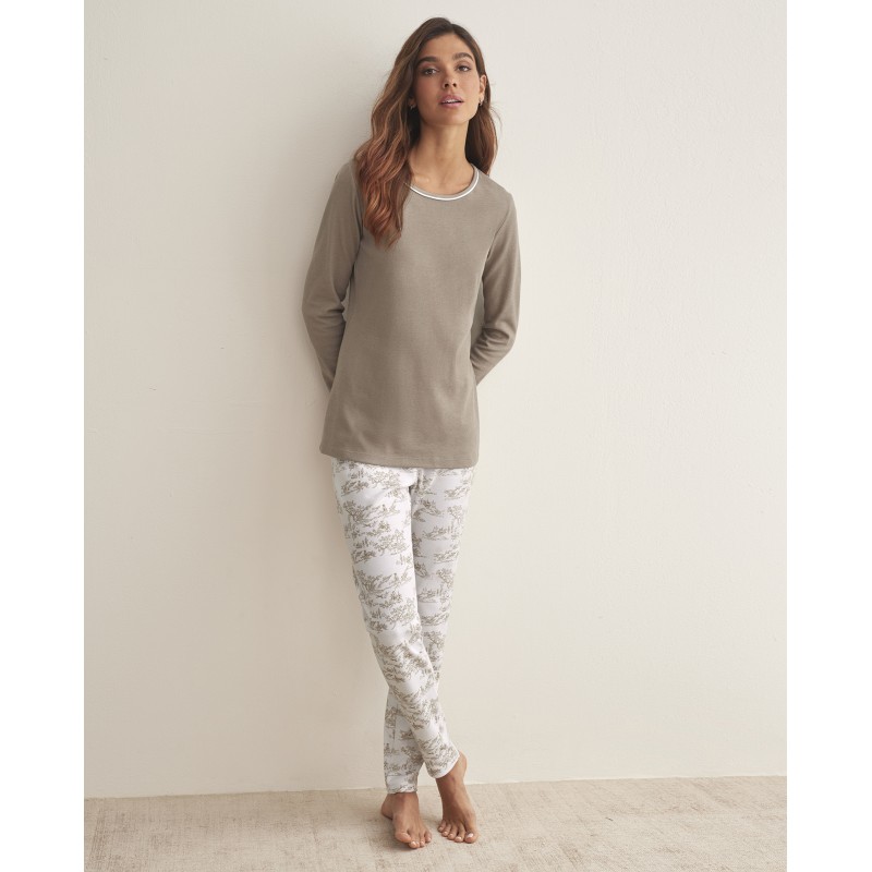 Pijama de mujer de dos piezas. Incluye camiseta de manga larga con cuello redondo y estampado liso, y pantalón largo con bolsillos y estampado romántico. Un conjunto perfecto para sentirte femenina y elegante en la intimidad de tu hogar. Ideal para esta temporada.