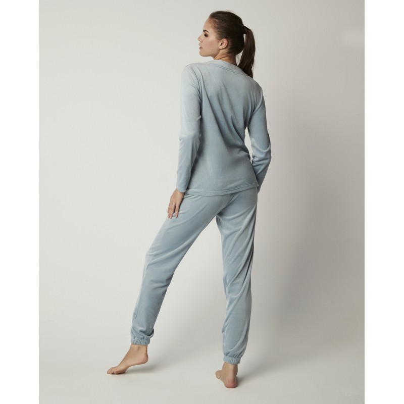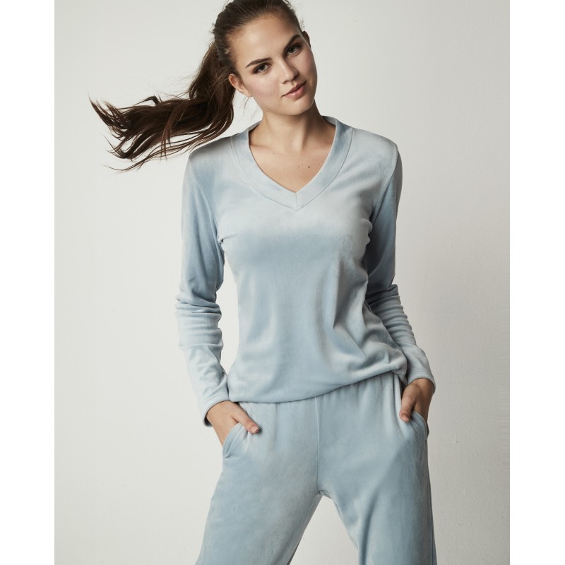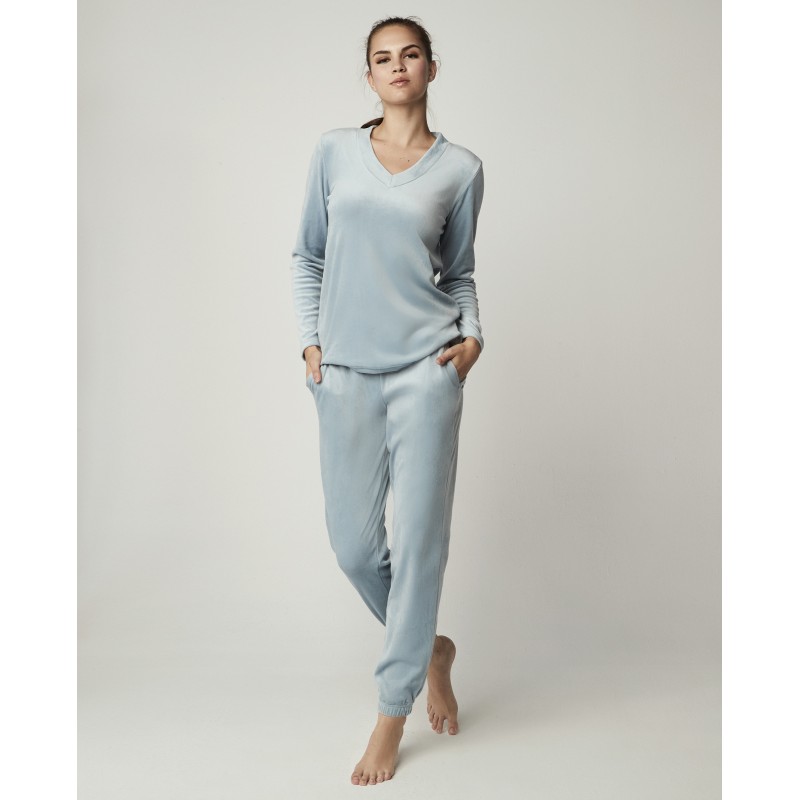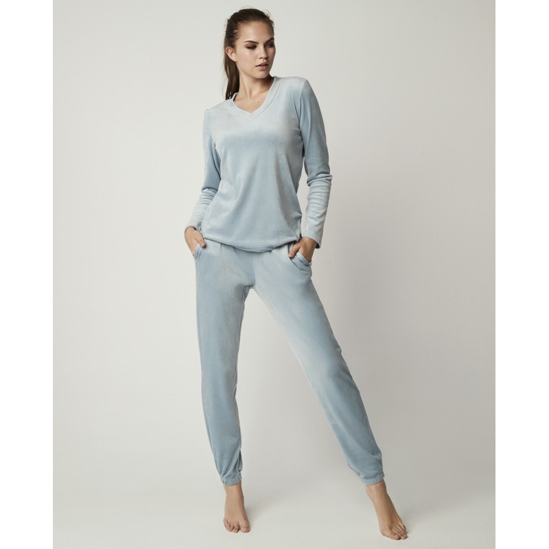 Pijama de dos piezas para mujer con camiseta de manga larga y escote en pico, y pantalón largo. Su textura extra suave y su diseño de dos piezas te brindan comodidad y elegancia, perfecto para dormir o estar en casa este invierno.