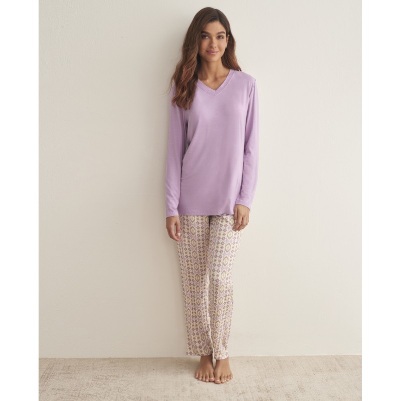 Pijama de dos piezas para mujer con camiseta de manga larga y escote en pico, y pantalón largo. Una combinación muy visual donde la camiseta es lisa monocolor y el pantalón con un estampado estilo étnico que lo convierten en una pieza original y alegre.