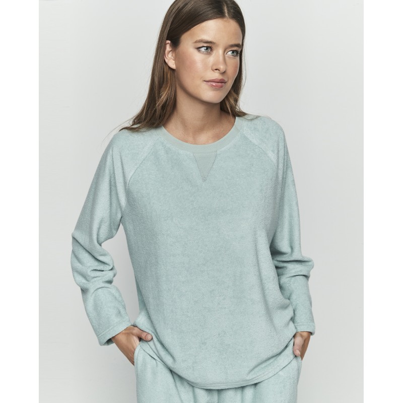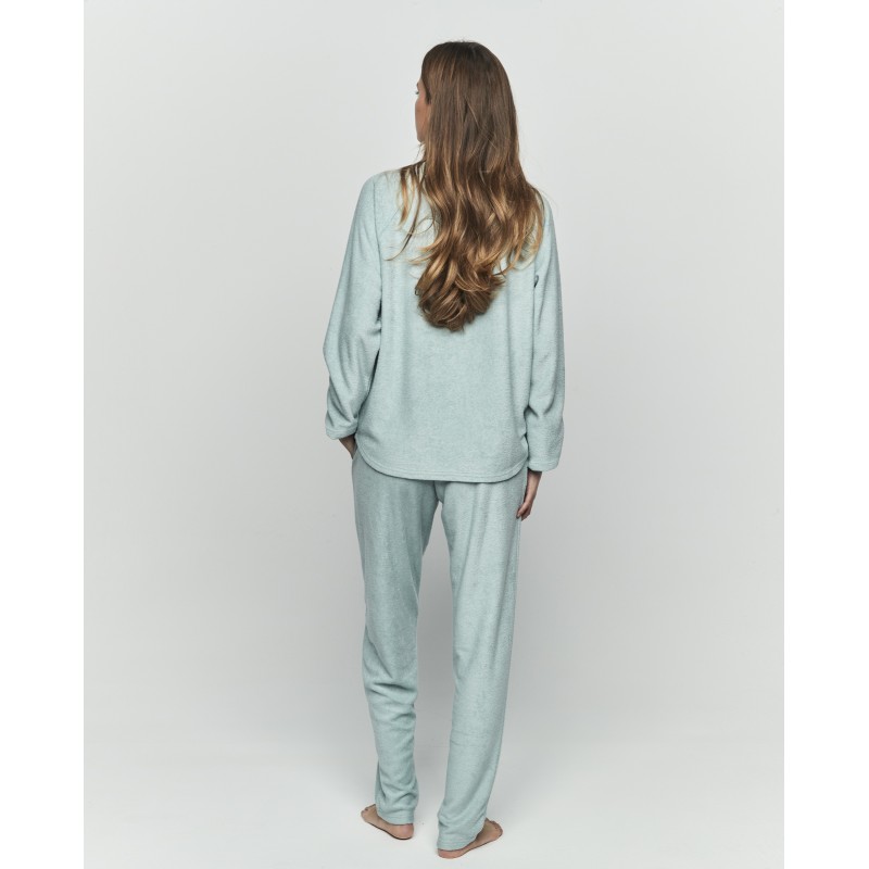Pijama de mujer de dos piezas. Confeccionado en tejido extra suave incluye camiseta de manga larga con cuello redondo y pantalón largo con bolsillos y lazo ajustable. Una prenda pensada para envolver tus noches en calidez y confort, porque no hay sensación más reconfortante como la de sentirse como en casa.