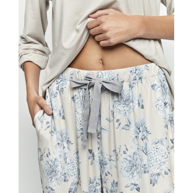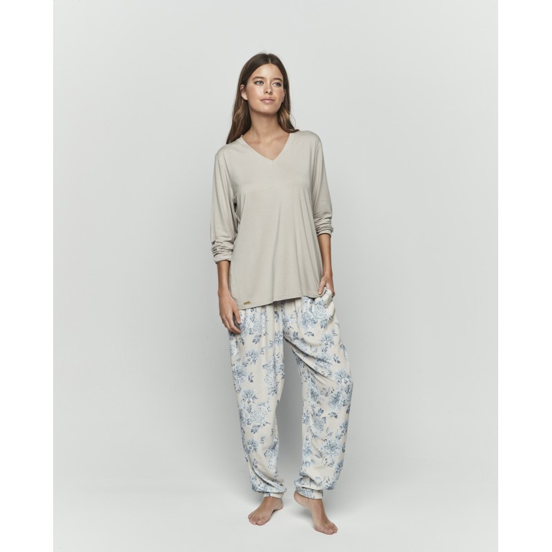 Pijama de mujer de dos piezas. Confeccionado en tejido extra suave incluye camiseta de manga larga con cuello escote en V y la parte inferior, pantalón largo con puño. Su estampado floral delicado, en tonos pastel, aporta un toque romántico y elegante, ideal para envolver noches de confort y sutileza.
