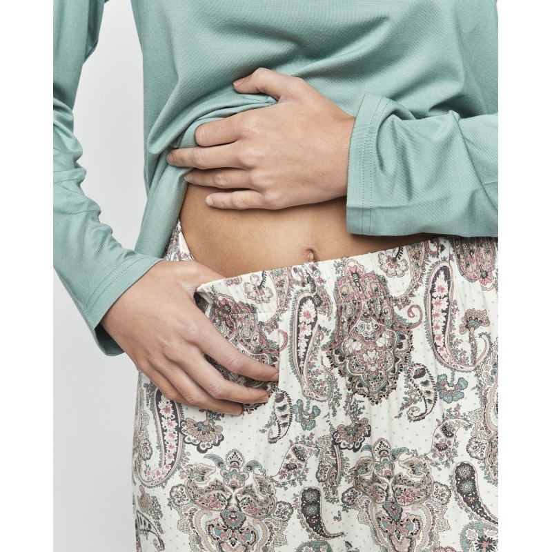 Pijama de mujer de dos piezas. Incluye camiseta de manga larga con cuello redondo y la parte inferior, pantalón largo con puño. Relájate con estilo con este camisón clásico que gracias a su exquisito estampado combina elegancia y comodidad para tu descanso.