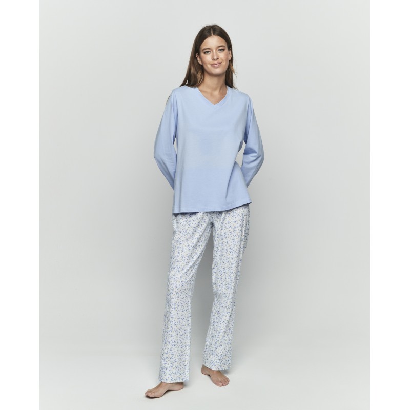 Pijama de mujer de dos piezas. Incluye camiseta lisa de manga larga con cuello en V y la parte inferior, pantalón largo con un estampado floral romántico que brinda suavidad, frescura y encanto. Comodidad absoluta para tus momentos en casa.