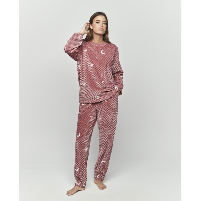 Pijama de mujer de dos piezas. Incluye camiseta de manga larga con cuello redondo y la parte inferior, pantalón largo con bolsillos. Gracias a su tejido super soft, descansar en casa con este conjunto se convertirá en tu mejor plan.