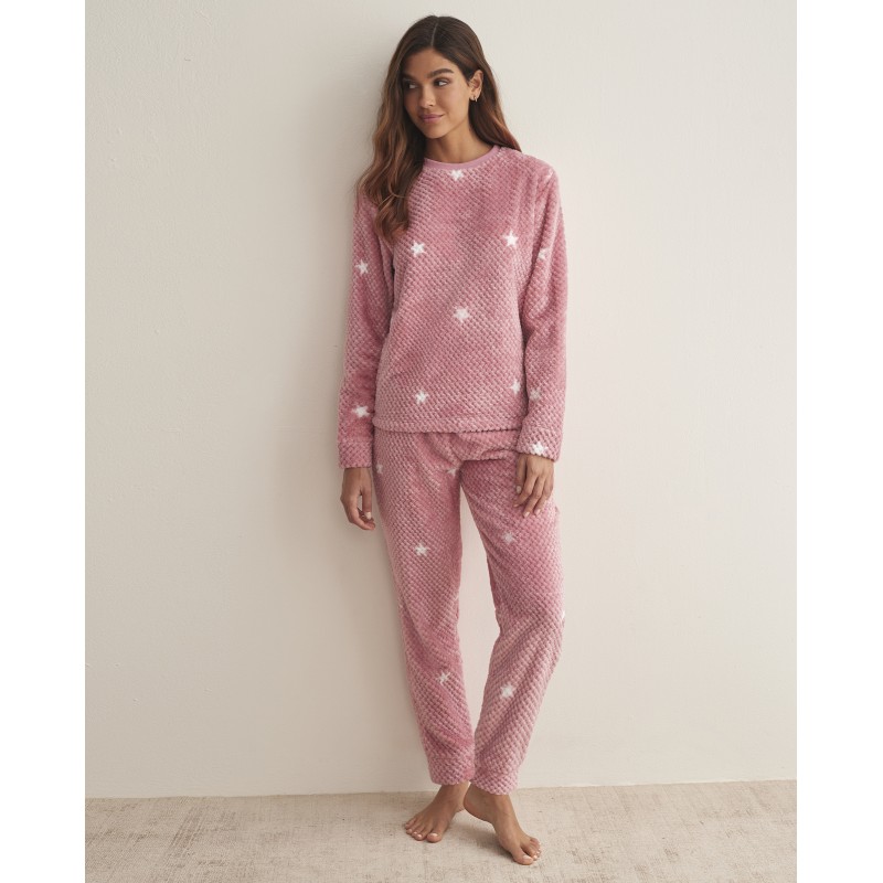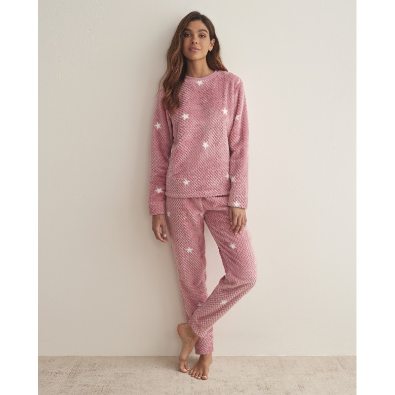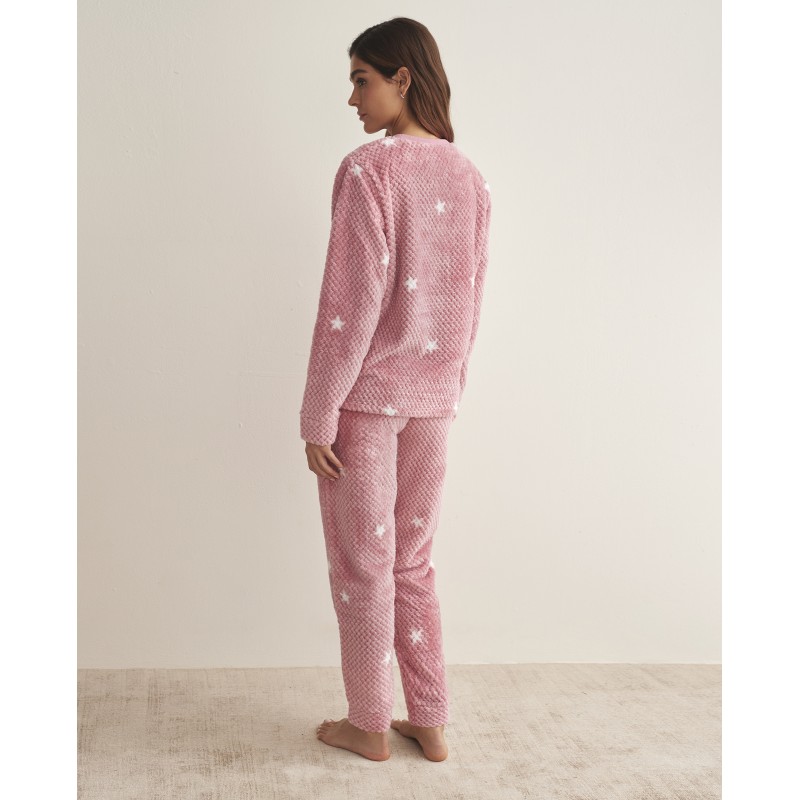 Pijama para mujer de dos piezas de manga larga. Cómodo y cálido gracias a su tejido polar, lo que lo convierte en una opción ideal para los días de invierno. Su estampado de estrellas le da un aire juvenil.