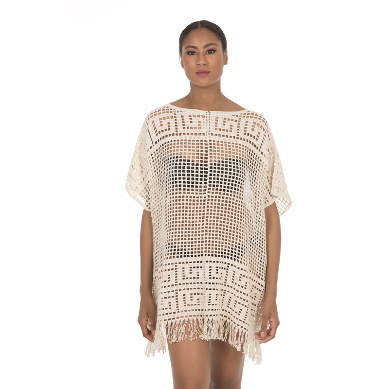Poncho crochet de algodón, corto con manga francesa. Con flecos y dibujos geométricos. De color arena.