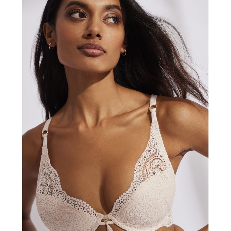 Sujetador de escote profundo. Moldea y realza. Su espectacular diseño de encaje le otorga un estilo romántico y bohemio a la vez. Este prenda conjuga sensualidad, frescura y elegancia, ideal para mujeres libres y auténticas.