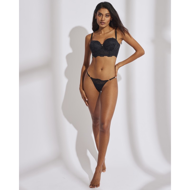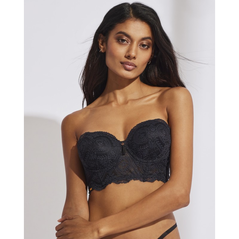 Sujetador bandeau estilo balconette. Con aro y copa interior con foam. De espaldilla ancha y ribete de silicona antideslizante. Su espectacular diseño de encaje le otorga un estilo romántico y bohemio a la vez. Este prenda conjuga sensualidad, frescura y elegancia, ideal para mujeres libres y auténticas.