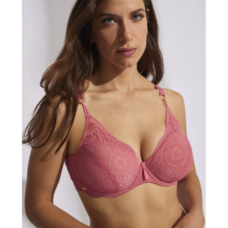Sujetador de capacidad de escote medio. Efecto control envolvente. Ideal para las tallas más grandes. Su espectacular diseño de encaje le otorga un estilo romántico y bohemio a la vez. Este prenda conjuga sensualidad, frescura y elegancia, ideal para mujeres libres y auténticas.
