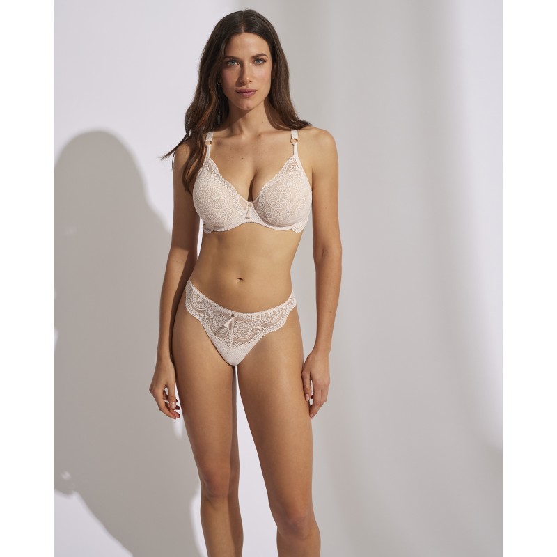 Sujetador de capacidad de escote medio. Efecto control envolvente. Ideal para las tallas más grandes. Su espectacular diseño de encaje le otorga un estilo romántico y bohemio a la vez. Este prenda conjuga sensualidad, frescura y elegancia, ideal para mujeres libres y auténticas.