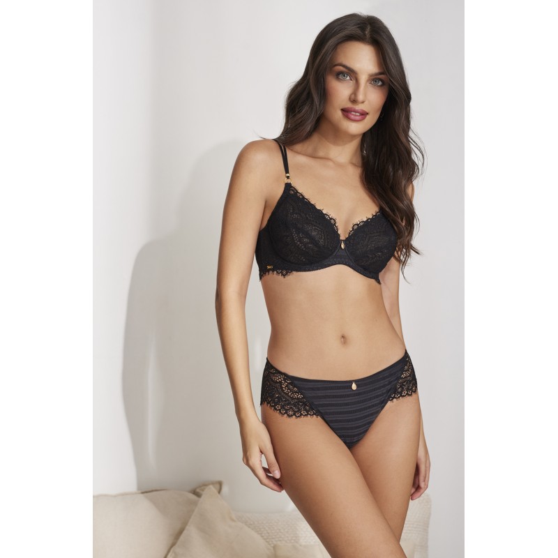 Sujetador de capacidad de escote medio. Efecto control envolvente. Ideal para las tallas más grandes. Combina una preciosa blonda geométrica y floral con un sutil adorno dorado. Este diseño inspirado en la diversión y la libertad, es ideal para disfrutar de nuestro lado más salvaje.