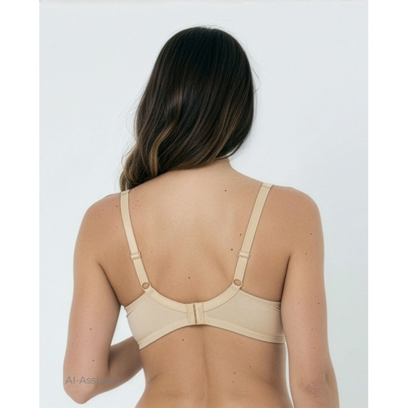 Sujetador de gran capacidad súper confort. Con efecto control envolvente, sin relleno. Moldea sin renunciar a la comodidad. Sin marcar costuras, garantiza una máxima sujeción. De color piel.