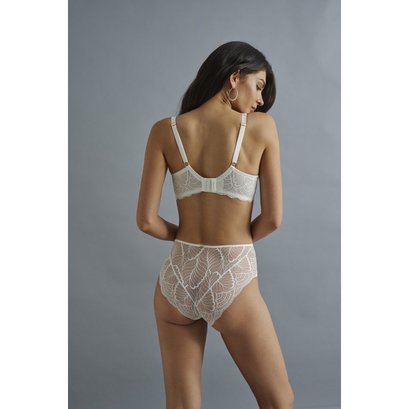 Sujetador de gran capacidad. Efecto control envolvente y sin relleno. Ideal para las tallas más grandes. De estética muy cuidada y ultra femenina. Su blonda evoca la naturaleza de las hojas convirtiéndola en una prenda elegante y atrevida.