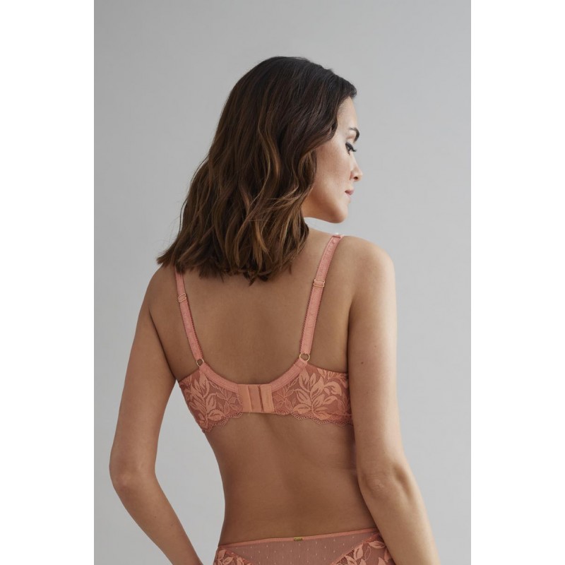 Sujetador de gran capacidad de escote alto. Efecto control envolvente y sin relleno. Ideal para las tallas más grandes. De estética muy atractiva y con carácter. Su blonda floral lo convierte en un diseño muy actual y juvenil.