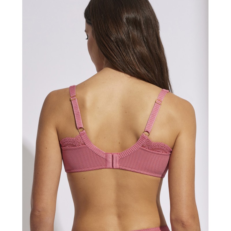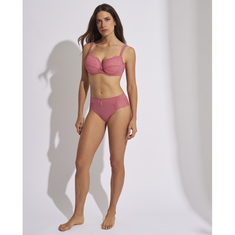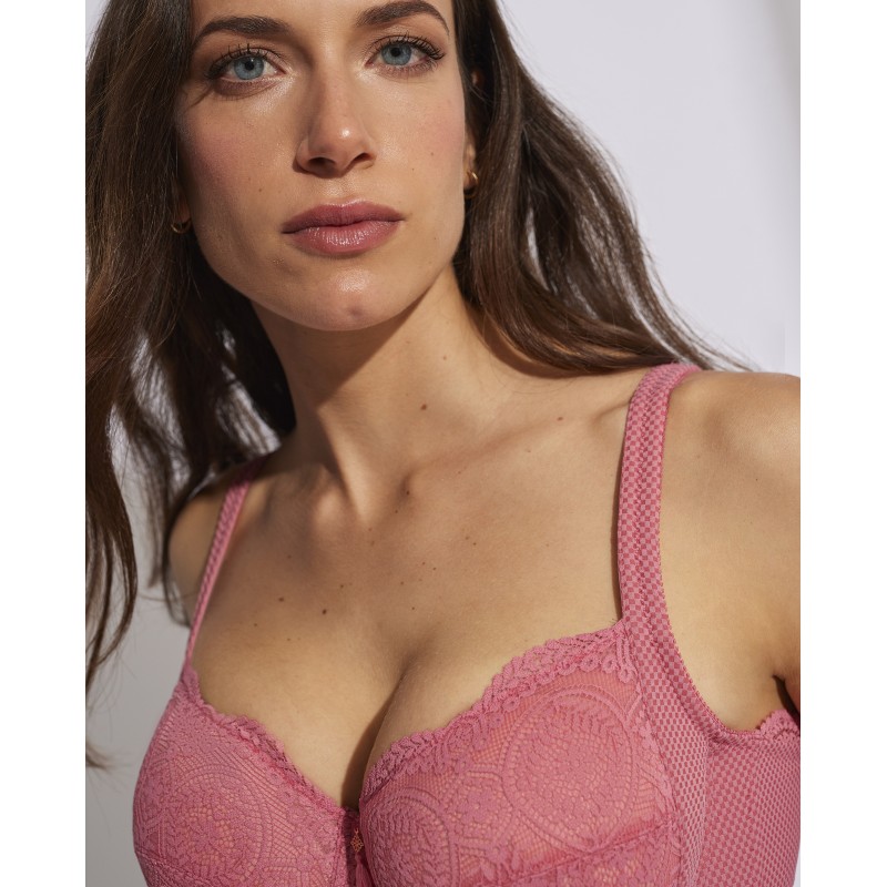 Sujetador de gran capacidad de escote alto. Efecto control envolvente y sin relleno. Ideal para las tallas más grandes. Su espectacular diseño de encaje le otorga un estilo romántico y bohemio a la vez. Este prenda conjuga sensualidad, frescura y elegancia, ideal para mujeres libres y auténticas.