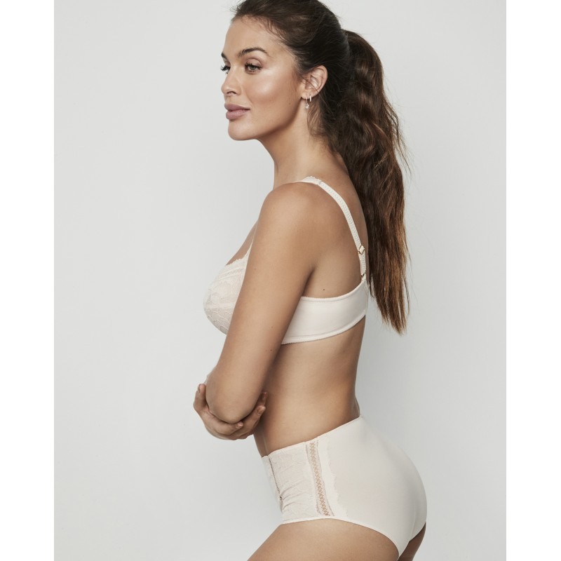 Sujetador de gran capacidad de escote alto y encaje floral. Efecto control envolvente. Cuenta con aro y varilla lateral. No tiene copa de foam. Ideal para las tallas más grandes. Su espaldilla está forrada de tul de control y tiene dos medidas de ancho de los tirantes según la talla, al igual que ocurre con su corchete de cierre, con la finalidad de adaptarse para aportar comodidad y la mejor sujeción. Además, sus tirantes son acolchados. Una prenda delicada y sofisticada. La colección Agatha, a la que pertenece, encarna la madurez y el esplendor de la marca, ofreciendo piezas que no solo adornan, sino que transforman. Una colección con encanto y carisma.