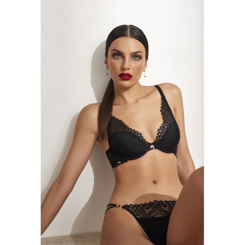 Sujetador de escote profundo. Moldea y realza. Combina una preciosa blonda geométrica y floral con un sutil adorno dorado. Este diseño inspirado en la diversión y la libertad, es ideal para disfrutar de nuestro lado más salvaje.
